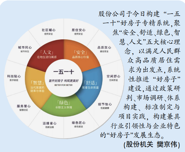 股份公司于今日构建“一五一十”好房子专精系统,聚焦“安全、舒适、绿色、智慧、人文”五大核心理念,以满足人民群众高品质居住需求为出发点,系统性推进“好房子”建设,通过政策研判、市场调研、体系构建、标准制定与项目实践,构建兼具行业引领性与企业特色的“好房子”发展生态。
